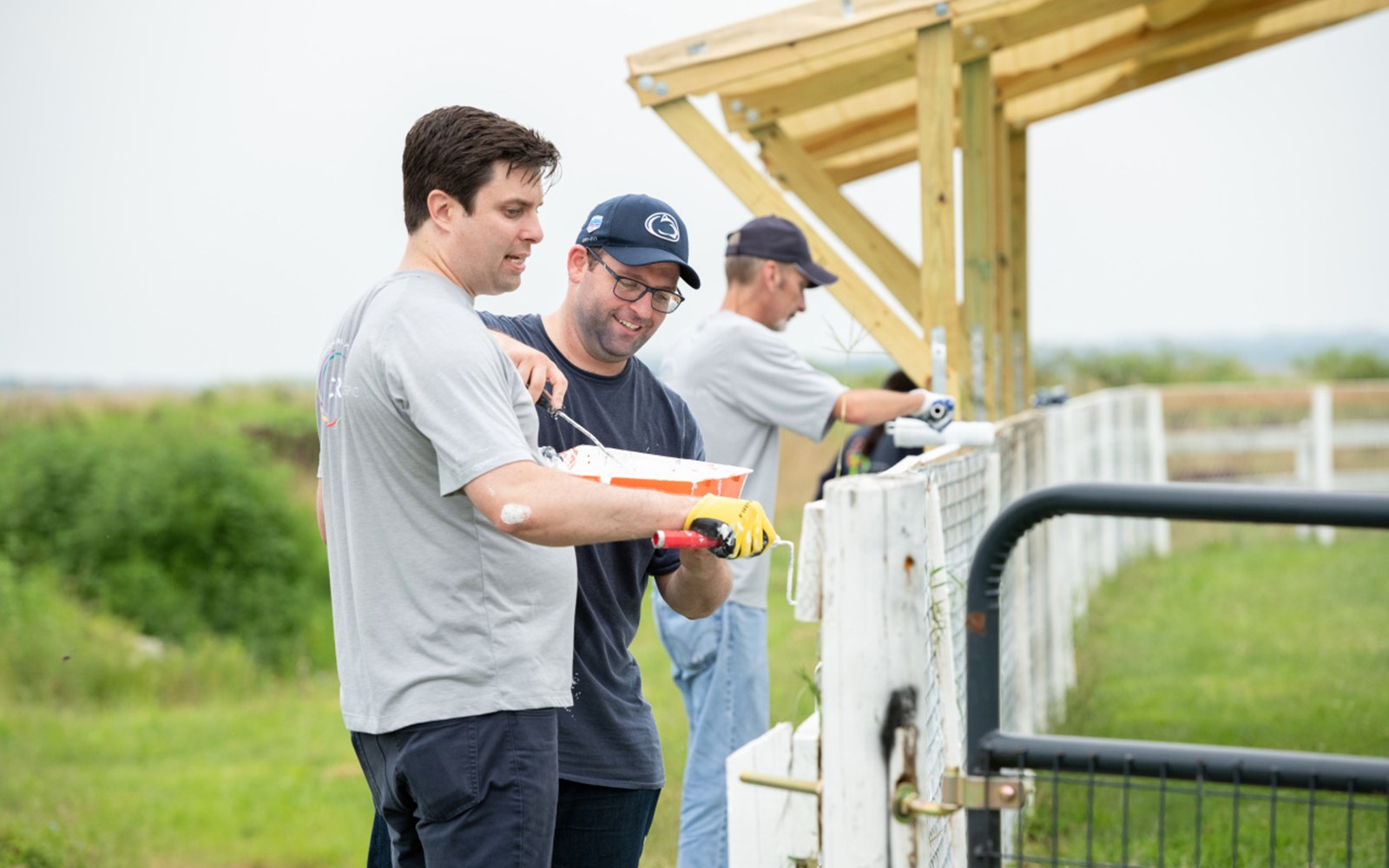 Employees started the morning learning about WCC’s efforts while three service dogs curiously watched them. Volunteers then split up into two groups—a few employees weeded garden beds and added a fresh layer of mulch while the rest painted the outside of the Welcome Center. Volunteers completed these tasks by mid-morning, then painted fences throughout the property.